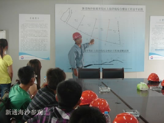 7月10日下午,剛剛做完錄職體檢的新員工們,乘坐公司大巴前往海新船務重工和新通海沙項目工地參觀。在海新重工,袁凌軍副總工程師向新同事們簡要介紹了工程規劃