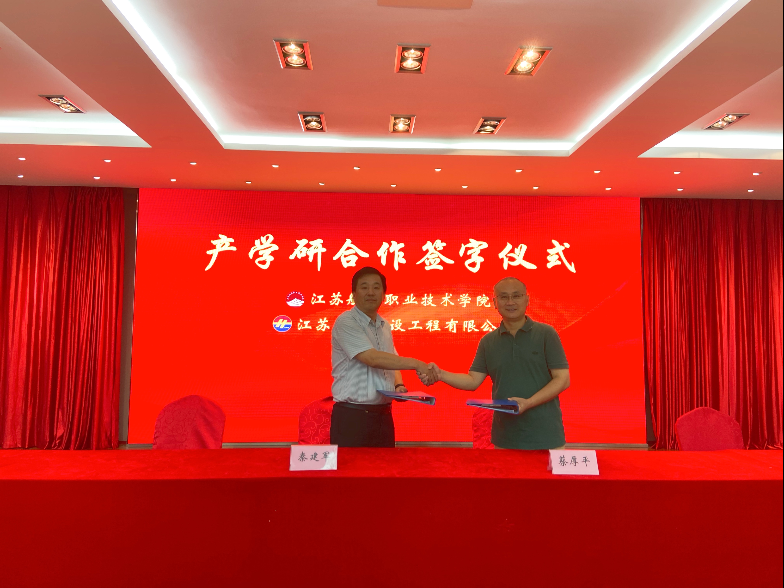 江蘇海宏秦總與江蘇航院蔡院長作為雙方簽約人簽署了“江蘇航院與江蘇海宏產學研合作”協議。