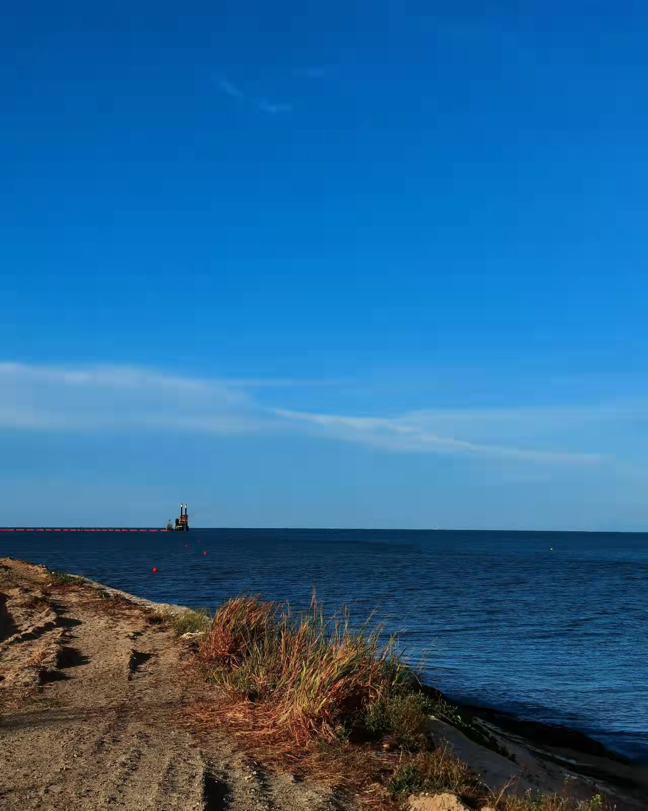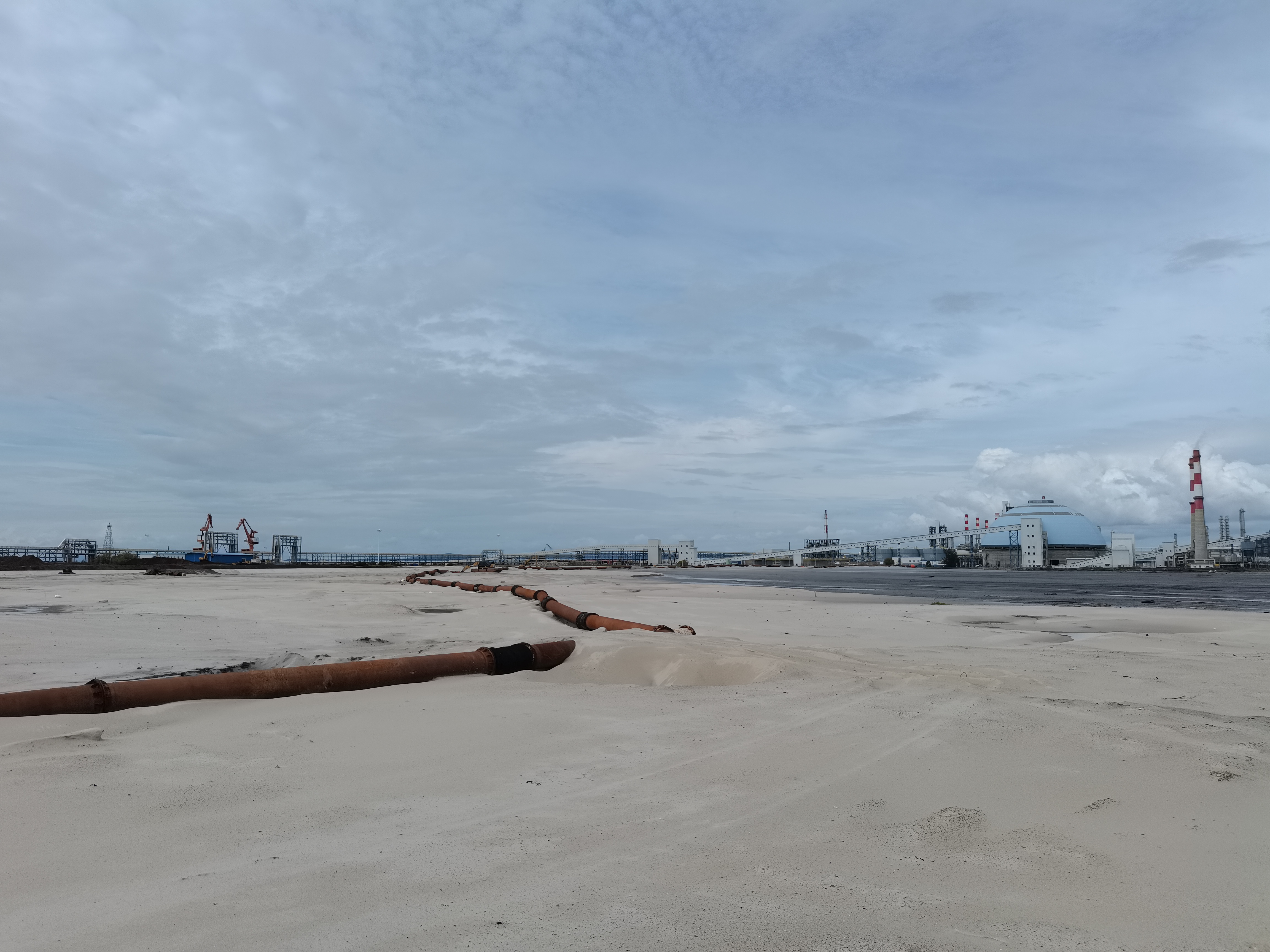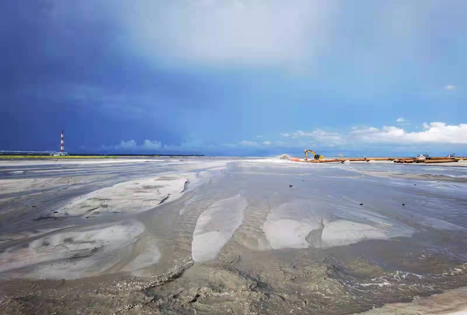 2021年8月21日,隨著本工程NTM(相當于國內的水上水下施工許可證,由海事局批發)的獲取,本工程的所有外部手續全部獲批,標志著本工程的正式開工。截至2021年10月15日,我們已完成北側堤、東側堤及火炬區所有區域約19.5萬m³砂墊層的鋪設,北側堤樁號B5+716~B6+014、東側堤樁號D0+000~D2+019塑料排水板的插設,北側堤樁號B5+731~B6+014、東側堤樁號D0+000~D1+708砂肋軟體排的鋪設,以及東堤D0+000~D1+319段水下一層袋裝砂的施工,已完成M1區吹填約110萬m³。