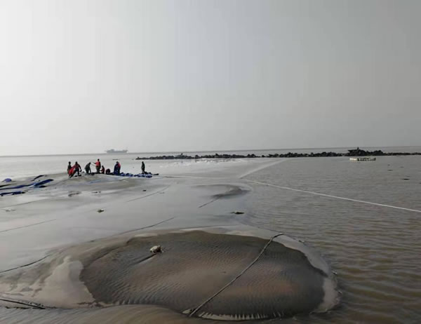 截至4月22日,方駁126已完成要求的所有沙肋軟體排的施工,包括后期新增的7張軟體排。而且在低潮位,船上還抽調人手對CD0+000-CD0+475區域進行溝槽段填槽,至4月底進度已過半。目前方駁126正在抓緊時間進行底層通袋的鋪設充灌,力爭實現1天2個潮水鋪設2個通袋,在最短的時間完成剩余的工作任務。