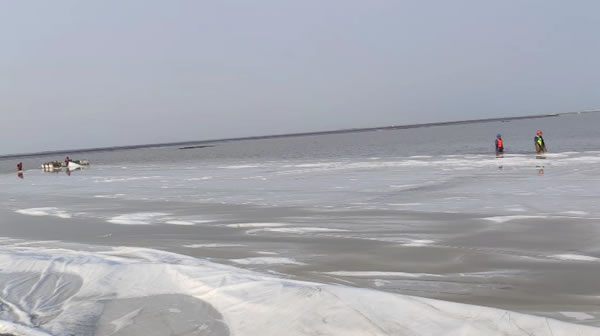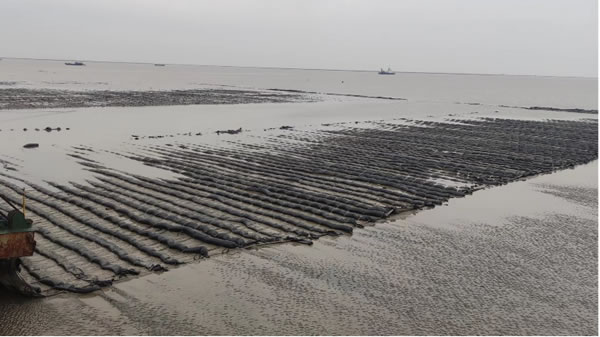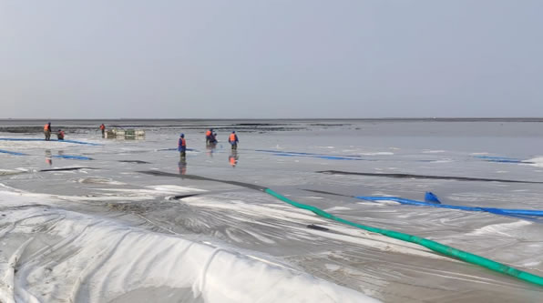 根據(jù)現(xiàn)場(chǎng)水深情況,水下通袋施工采用人工鋪設(shè)與鋪排船鋪設(shè)相結(jié)合的方式施工。人工鋪設(shè)采用沉管施工,在低潮位時(shí)人工定位管頭位置,高潮位時(shí)將管頭拖至指定位置并沉管。人工鋪設(shè)選在低平潮、水深深度約1m以下時(shí)施工,施工定位采用手持GPS四角定位、人工將通長(zhǎng)袋拉置指定位置。先將四角打沙沉入水底,在漲潮前移一次管頭從中間開始打砂。鋪排船鋪設(shè)與鋪排方式基本相同。
