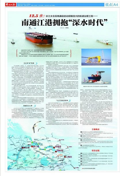 如果說長江口12.5米深水航道的打通稱得上是長江“龍昂首”,那么,12.5米深水航道向南京延伸則稱得上是“龍挺胸”。幾年后,南通沿江港區將迎來長江下游12.5米深水航道溯江而上的“深水時代”。